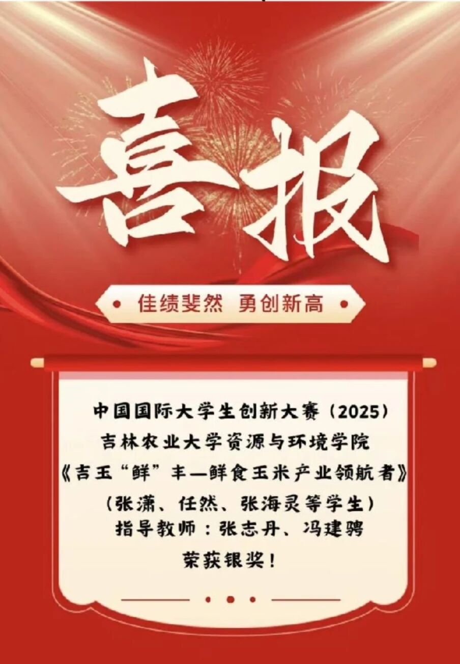 中国国际大学生创新大赛(2025)在河南郑州大学正式落下帷幕。本次大赛历时整整五个月,以“我敢闯,我会创”为主题,吸引全球161个国家和地区、5673所学校的619万个项目、2443万人次参赛,已成为推动中外科技交流和青年人文交流的重要平台。由吉林农业大学资源与环境学院张志丹教师团队所指导的项目,经历层层角逐,斩获本科生创意组高教主赛道银奖,为我院在该项赛事上又一次取得了国家级银奖!也为吉林农业大学国家级银奖数量上实现了新突破!
