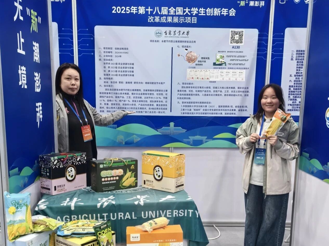 全国大学生创新年会由教育部发起、国家级大学生创新创业训练计划专家工作组主办,是全国高校本科教学改革中覆盖面最广、学生参与最多的年度盛会之一。2025年11月,第十八届全国大学生创新年会国赛线下赛在南京大学(苏州校区)举行,吉林农业大学资源与环境学院选送项目(张志丹老师指导)----“《水肥节约型土壤调理剂研发及应用》(张海灵、张潇、张苧丹等)”历经层层遴选,作为吉林农业大学唯一一支代表队参赛,最终代表学院首次站上国创年会线下赛舞台,实现资环学院“国创赛”历史“零的突破”,祝贺他们为资环学院争光添彩!