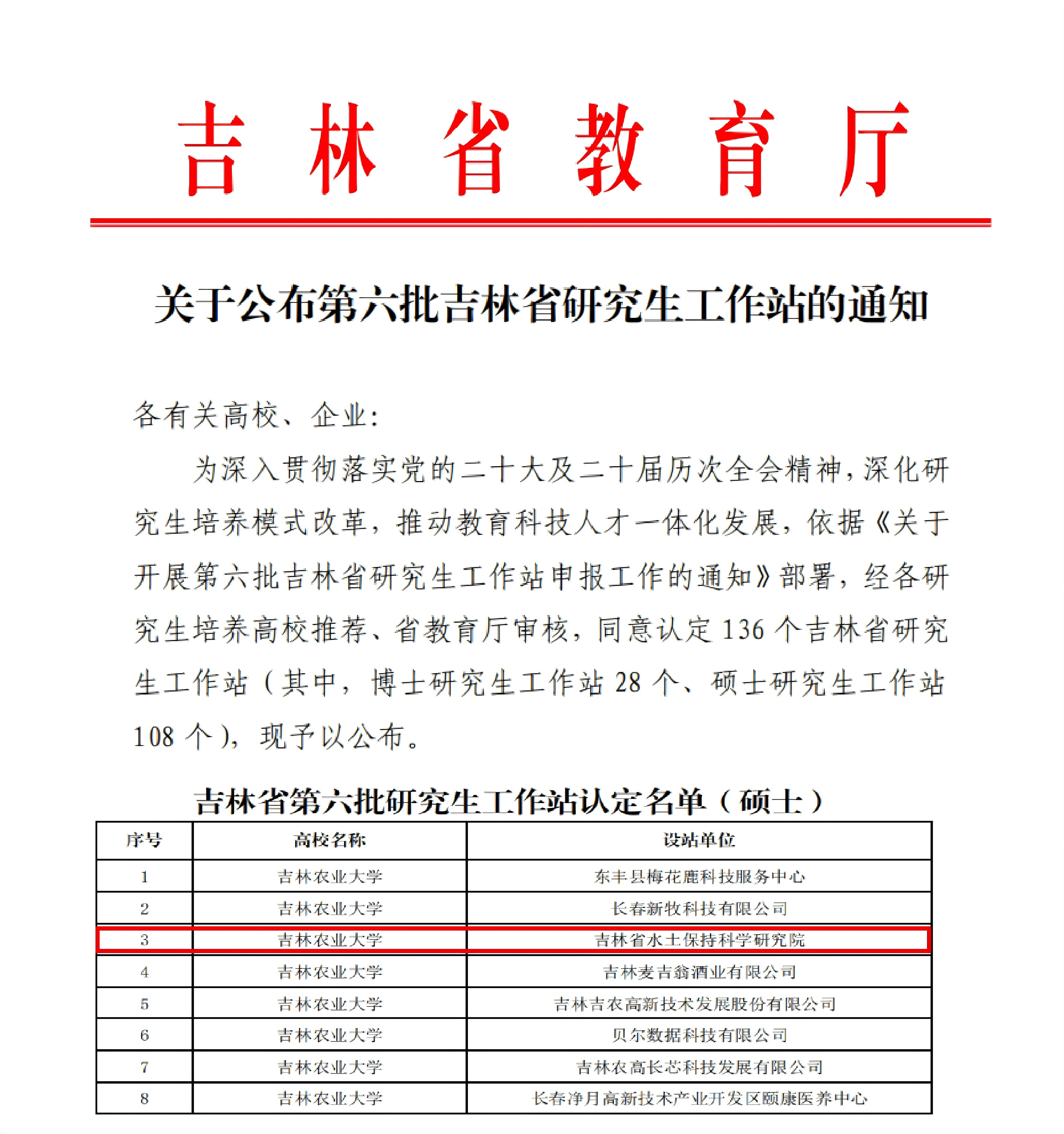 3月30日,吉林省教育厅发布《关于公布第六批吉林省研究生工作站的通知》,水土保持与荒漠化防治学科与吉林省水土保持科学研究院合作设立的研究生工作站获批建设。