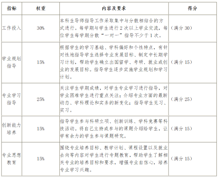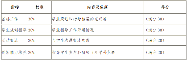 (二)监督本科生导师是否能按学院要求完成职责,此项工作由各系主任及学生代表完成,对综合评分不满80分的本科生导师进行重点监督,具体评价标准见下表: